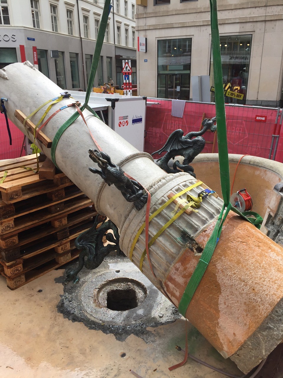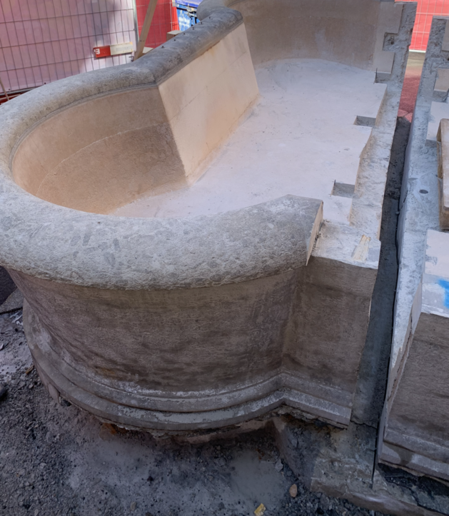 In umgekehrter Reihenfolge, wie der Brunnen zusammengebaut wurde, nahmen wir ihn auseinander. Zuerst wurde der Brunnenstock – die Mittelsäule mit dem Dreizack und den vier Wasserspeiern – demontiert (Foto: «Die Mittelsäule des Dreizackbrunnens»). Anschliessend wurde der vordere Teil des Brunnenbeckens genau dort auseinandergeschnitten, wo es zusammengesetzt wurde (Foto: «Der Dreizackbrunnen wird in zwei Hälften zerlegt»). Der Stock und der vordere Teil liegen nun auf einem Lagerplatz der IWB. In einem nächsten Schritt bauen wir die Brunnenstube um, damit sie mit dem neuen Standort des Brunnens übereinstimmt. Die Brunnenstube ist der Raum unter dem Brunnen, durch welchen die Wasserleitungen geführt sind. Nachdem wir rund um den Brunnen alle Werkleitungen saniert haben, verschieben wir den hinteren Teil des Brunnenbeckens rund zwei Meter gegen die Strassenmitte und bauen alles und wieder zusammen. Dieses Vorgehen ist einerseits aufwendig, andererseits, durch die Zusammenarbeit mit den richtigen Spezialisten, aber hochinteressant.