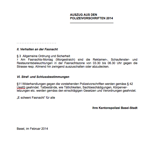 Am 10. März 2014 ist es wieder soweit: Genau um 04.00 Uhr beginnt die Basler Fasnacht mit dem Morgestraich und dies schon seit 1835. In den letzten Jahren ist es dank Ihrer aktiven Mitwirkung gelungen, das Ziel Morgestraich ohne beleuchtete Schaufenster, Leuchtreklamen und Hauseingängen mit wenigen Ausnahmen zu erreichen. Wir schätzen Ihr Engagement sehr. Trotzdem dürfen wir alle in unseren Bemühungen auf keinen Fall nachlassen. Deshalb bitten wir Sie auch in diesem Jahr, die Lichtanlagen Ihres Geschäftes am Morgestraich zu löschen, oder das Fenster gegen die Strasse abzudecken und bis 06.30 Uhr verdunkelt zu lassen. Das Abdecken gilt insbesondere für die Restaurants, welche innen beleuchtet sind.