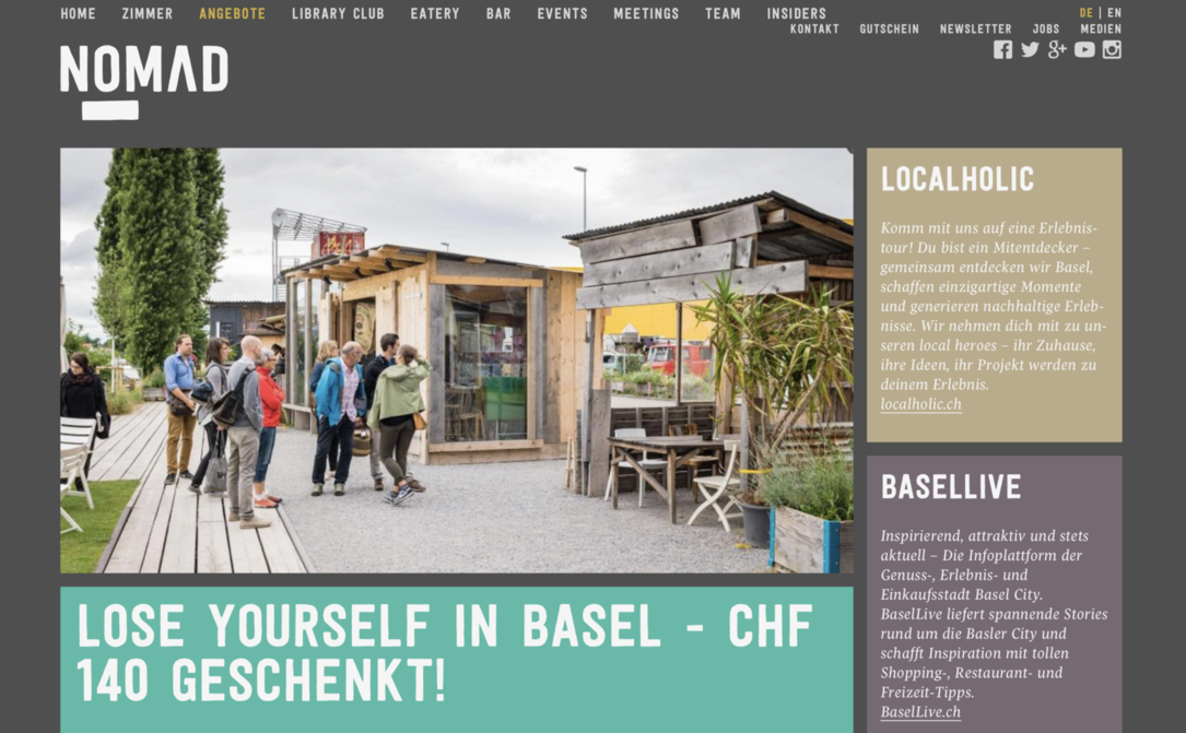Das Lifestyle-Hotel Nomad im Brunngässlein hat sich entschlossen, neue Wege zu gehen und seinen Hotelgästen mehr als «nur» eine Übernachtung zu einem guten Preis in einem der trendigen Zimmer zu bieten. Gemeinsam mit BaselLive und localholic hat man unter dem Motto «Lose yourself in Basel» ein einzigartiges Package zusammengeschnürt, das es so bisher noch nicht gegeben hat – Erlebnisfaktor und Convenience spielen dabei jeweils eine tragende Rolle. Die Gäste erlangen so die Möglichkeit, auf einfachste Weise das Maximum aus ihrem Aufenthalt herauszuholen.
