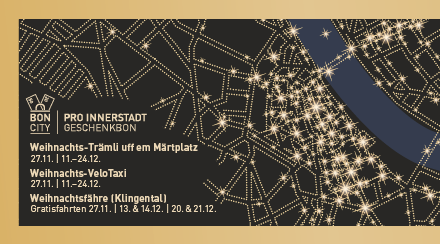 Mit dem Weihnachts-Trämli auf dem Marktplatz vom 11. – 24.12., dem Weihnachts-Velo Taxi vom 11. – 24.12. und der Weihnachtsfähre (Klingental) mit Gratisfahrten am 13./14.12 und 20./21.12.
