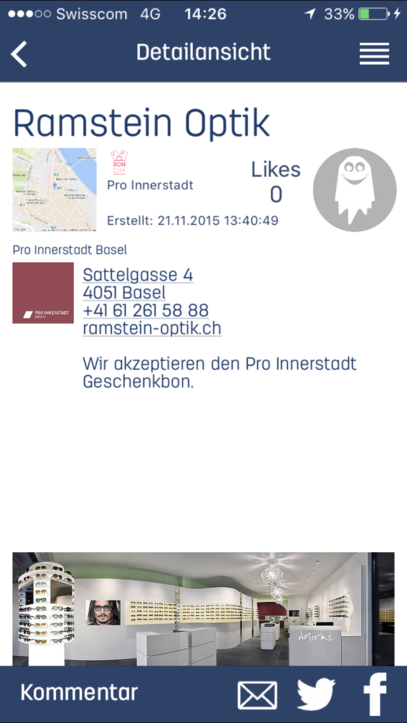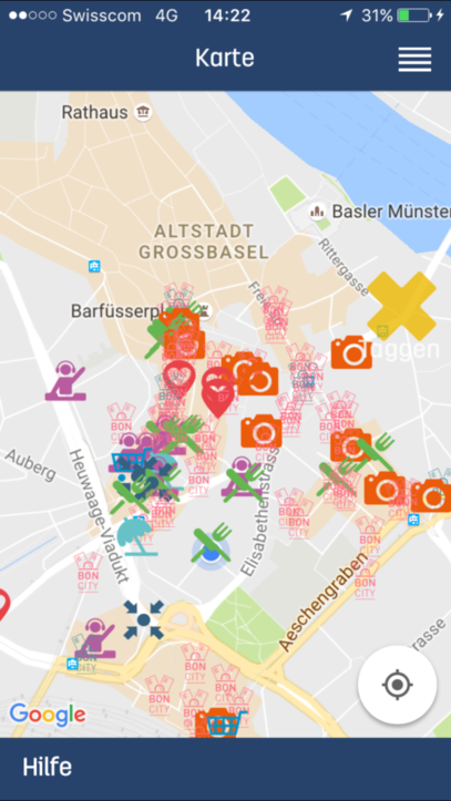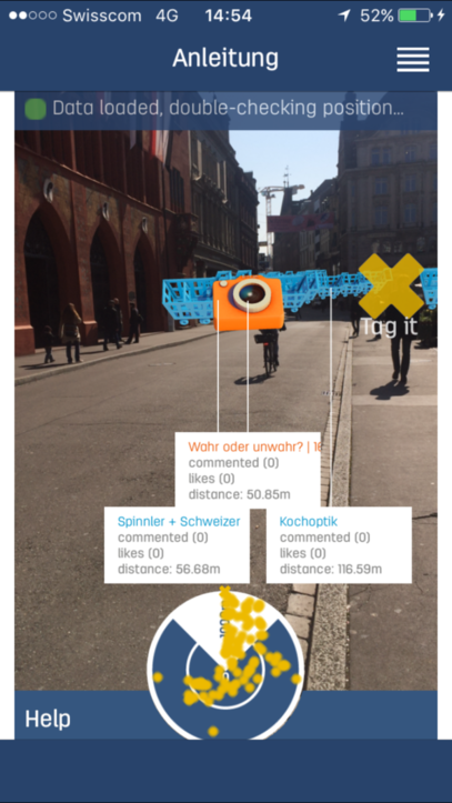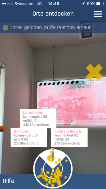 Mit der Tagxy App können Sie nebst vielen anderen Sachen auch Pro Innerstadt Basel Geschäfte, sprich offizielle Annahmestellen der Pro Innerstadt Basel Geschenkbons finden. Mit der fortschrittlichen Applikation betrachten Sie Ihre Umgebung durch die Kamera Ihres Smartphones und entdecken dabei in der realen Welt Fotos, Videos, 3D-Objekte und Empfehlungen. Suchen Sie z.B. ein passendes Restaurant in Ihrer Nähe, dann schauen Sie sich einfach mit der Kamera von Tagxy um und lassen sich die besten Orte in Ihrer Umgebung zeigen. Auch auf der integrierten Karte finden Sie Ihr gesuchtes Geschäft problemlos. Wenn Sie jedoch z.B. ein gutes Restaurant kennen, welches aber noch garnicht in der App aufgeführt ist, dann können Sie dies gleich selber für die anderen Nutzer taggen.